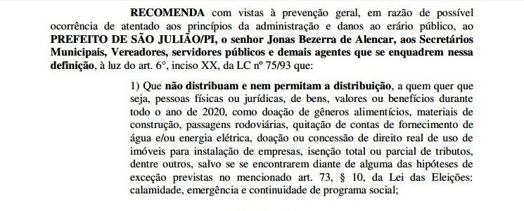 O Ministério Público do Estado do Piauí (MPPI), por meio da promotora da 40ª Zona Eleitoral de Fronteiras – PI, Micheline Ramalho Serejo da Silva expediu recomendação ao Prefeito de São Julião – PI, Jonas Bezerra de Alencar, ao atual Presidente da Câmara dos Vereadores, João Neto Leal e a todos os agentes públicos, como secretários municipais, vereadores, servidores públicos e demais agentes que se enquadrem nessa definição. O objetivo é evitar que a pandemia do novo Coronavírus (COVID-19) seja utilizada para promoção eleitoral.