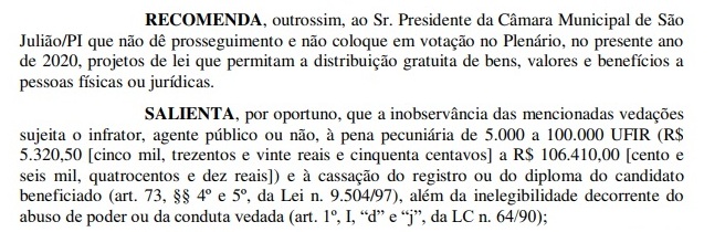 A Promotoria eleitoral recomenda ainda que, em 2020, o presidente da Câmara Municipal não dê prosseguimento nem coloque em votação no Plenário projetos de lei que permitam a distribuição gratuita de bens, valores e benefícios a pessoas físicas ou jurídicas.