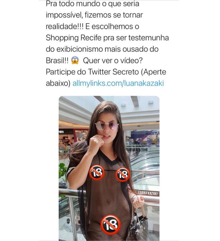A atriz de conteúdo adulto Luana Kazaki resolveu sair à vontade pelo Shopping Recife na noite do último sábado (09/01). Ela postou uma foto em que aparece nua, usando apenas uma roupa transparente durante sua passagem no centro de compras, na Zona Sul da cidade. As informações são do Portal PE10.