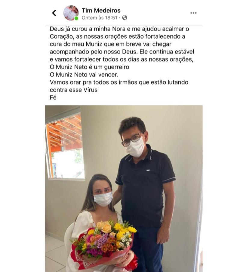 “As orações estão fortalecendo a cura do meu Muniz que em breve vai chegar acompanhado pelo nosso Deus”, postou o prefeito em sua página no Facebook.