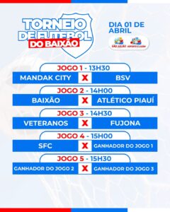 A programação começa na Localidade Baixão com o tradicional torneio da Quarta-feira Santa. Os jogos iniciam a partir das 13h30: